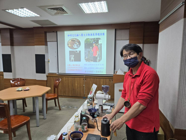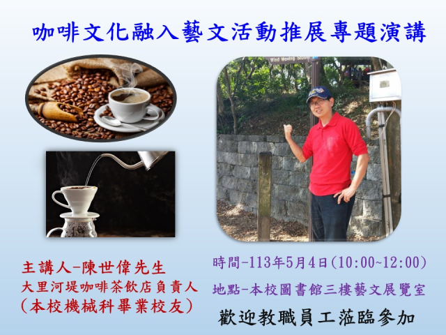 活動配合65周年校慶,邀請本校校友陳世偉先生蒞校討論(大里河堤咖啡茶飲店負責人)咖啡文化融入藝文活動推動的意義與方式,並結合本校遷校20周年成果展之藝文展覽。除了本校師生外,也邀請學生及校友一起蒞臨。透過咖啡的歷史與品種介紹,親自示範咖啡的沖泡方法給參與人員分享,除了一邊喝咖啡外,更在藝文展覽的氛圍下,欣賞優美的畫作,達到雙重的藝文與美感經驗。