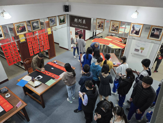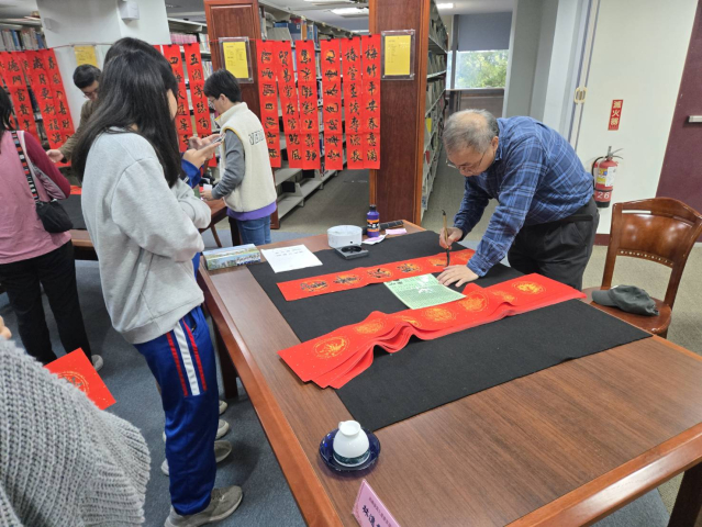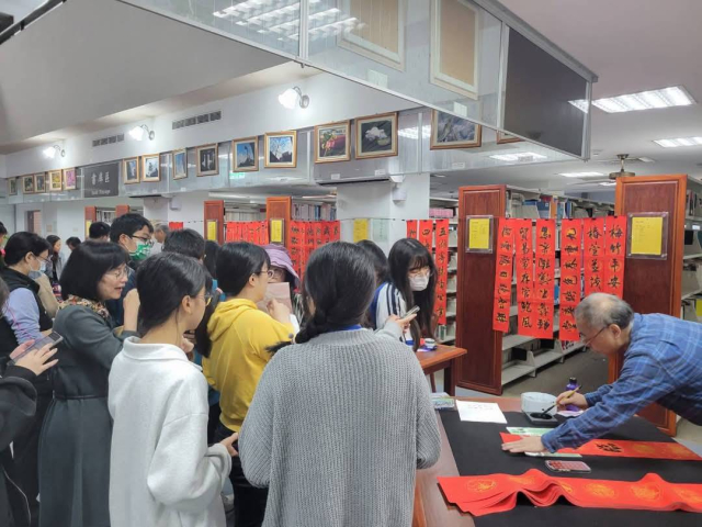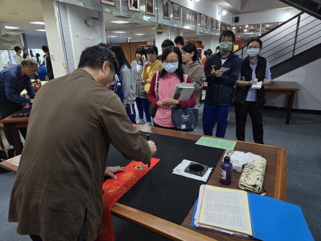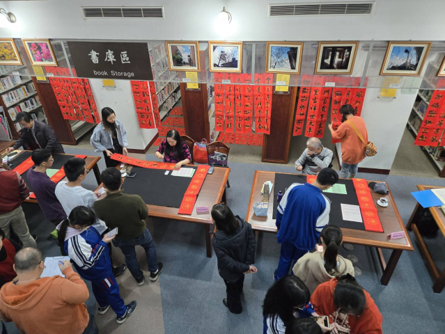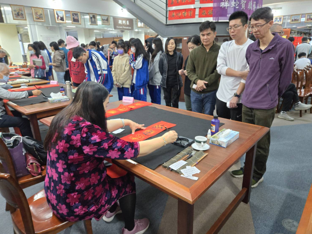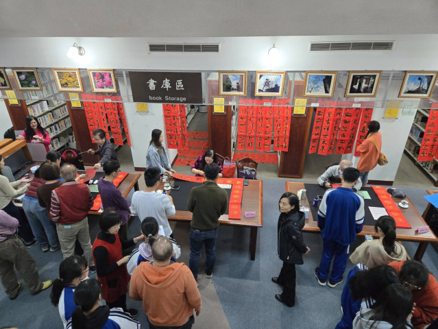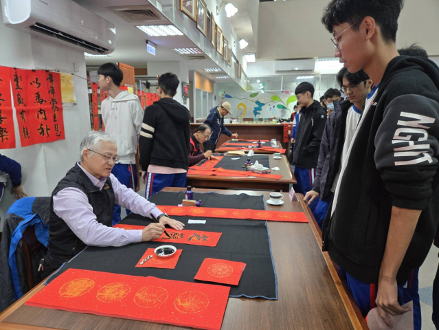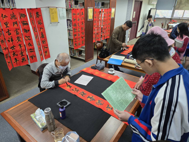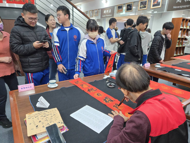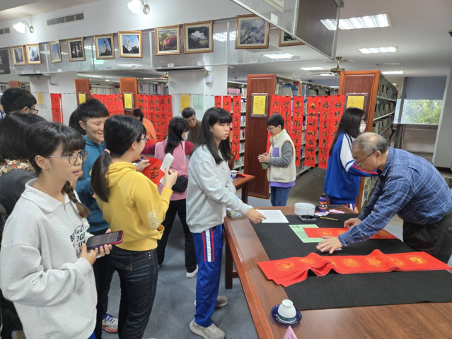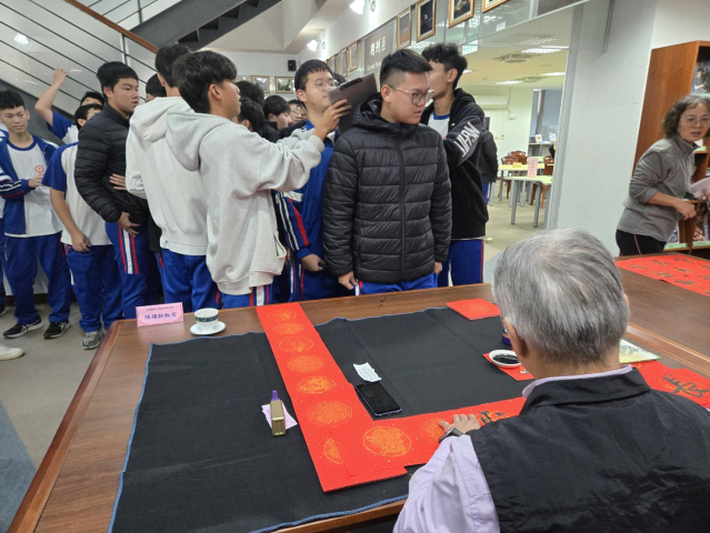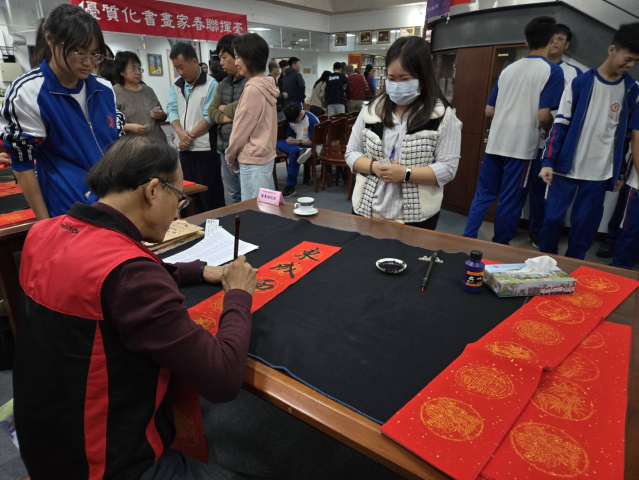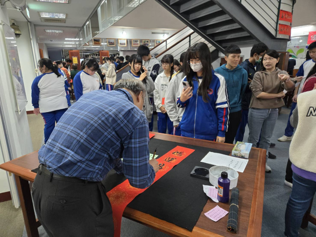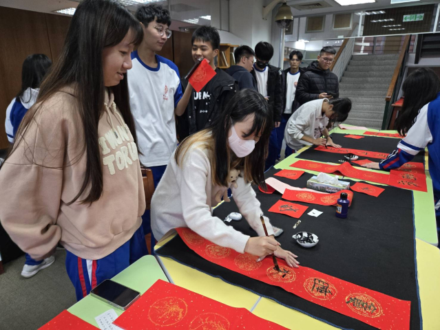 圖書館26日與南投縣明道文化薪傳協會合辦春聯揮毫活動,熱情邀請知名書法藝術家蒞臨草屯商工現場春聯揮毫,包括南投縣文化局林榮森局長、柯智美理事長、吳明晃校長、曾惠楨校長、陳耀銓教官、林進發老師、洪嘉勇老師、鄭連鈺老師等8人。讓全校師生對於傳統年節有不一樣的學習,師生在藝術家的指導下,圍繞在藝術家前專注欣賞如何書寫春聯,請教春聯的意涵,無形中拉近了師生與藝術的距離;現場也提供學生揮毫活動,讓學生自己寫下春聯及今年的願望,校園生活中處處充滿藝文氣息,已有過年的氛圍。透過春聯揮毫教學活動,將藝術融入於校園之內,讓師生們體驗中華文化之美,是一次非常有教育意義的傳統藝術與學習活動。