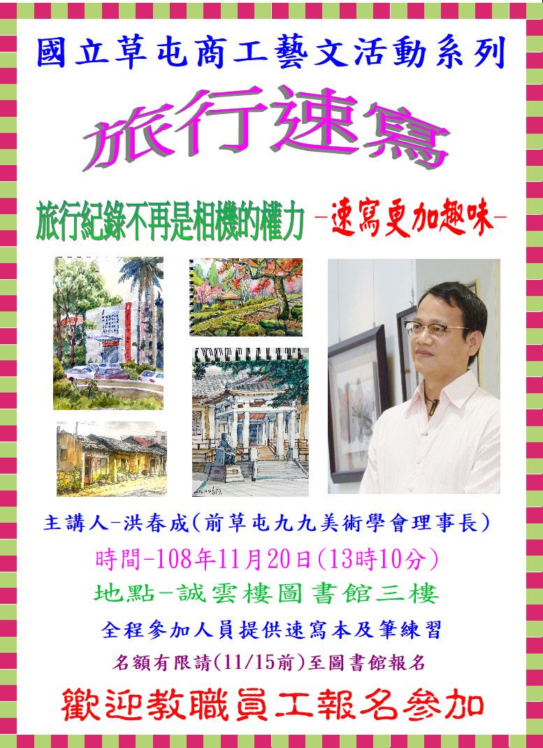 時間:109年6月17日(星期三)13:10~15:00 地點:圖書館藝文自主學習室 講座:洪春成老...