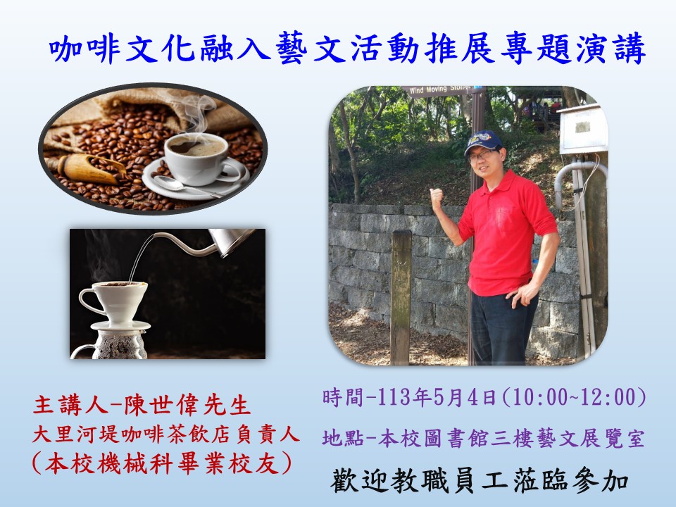 活動配合65周年校慶,邀請本校校友陳世偉先生蒞校討論(大里河堤咖啡茶飲店負責人)咖啡文化融入藝文活動...